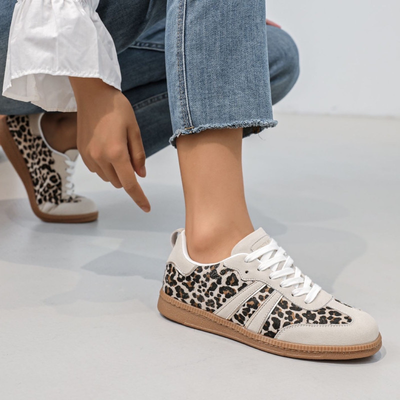 Avec son imprimé léopard audacieux, la basket Savannah dynamise instantanément n’importe quelle tenue. Sa base claire contraste avec la semelle camel rétro pour un rendu à la fois tendance et facile à porter au quotidien.