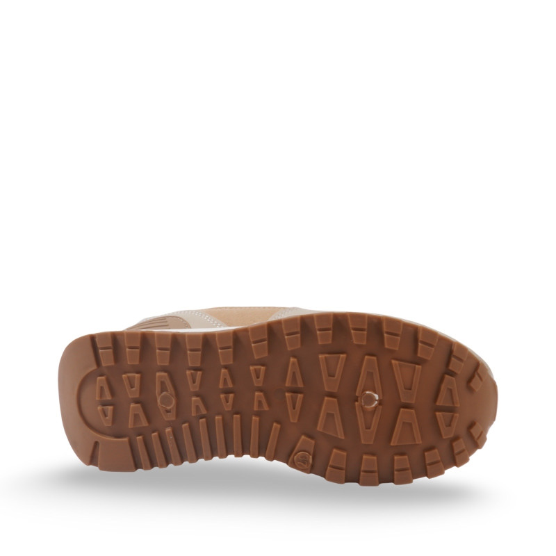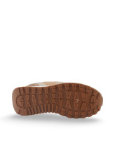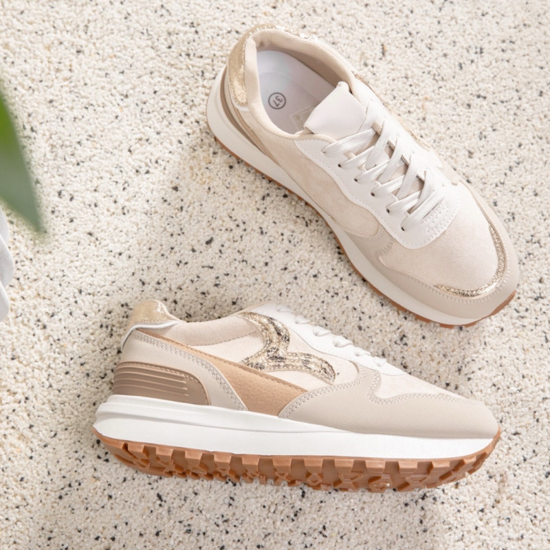 Son design mise sur l’harmonie des teintes naturelles, avec des touches de textile effet suède, de matière synthétique haut de gamme et un empiècement pailleté qui capte délicatement la lumière. Le tout repose sur une semelle épaisse crantée, légère et amortissante.