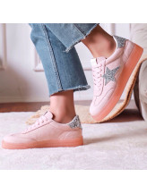 Cette sneaker basse affiche une allure dynamique et audacieuse grâce à son association de bleu intense et de rose vif comme rose et argent pailleté.