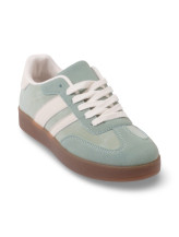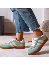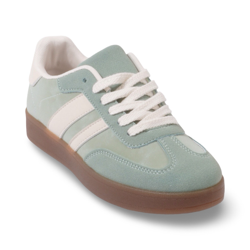 Cette basket basse affiche un style rétro revisité, avec une matière effet suédé soulignée par des bandes latérales en contraste. Le contrefort assorti apporte une touche douce et féminine, tandis que les lacets blancs équilibrent l’ensemble avec sobriété.