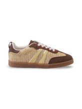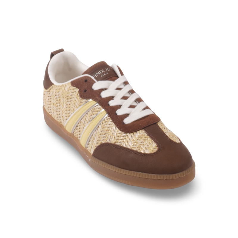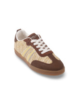 Cette sneaker basse séduit par son esprit naturel et raffiné, mettant en avant une finition textile tressée aux nuances beige doré.