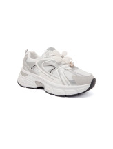 Cette basket au design contemporain séduit par son allure dynamique et résolument tendance. Elle associe une matière synthétique haut de gamme blanche à des empiècements gris clair et argentés, créant un jeu de contrastes moderne et lumineux.