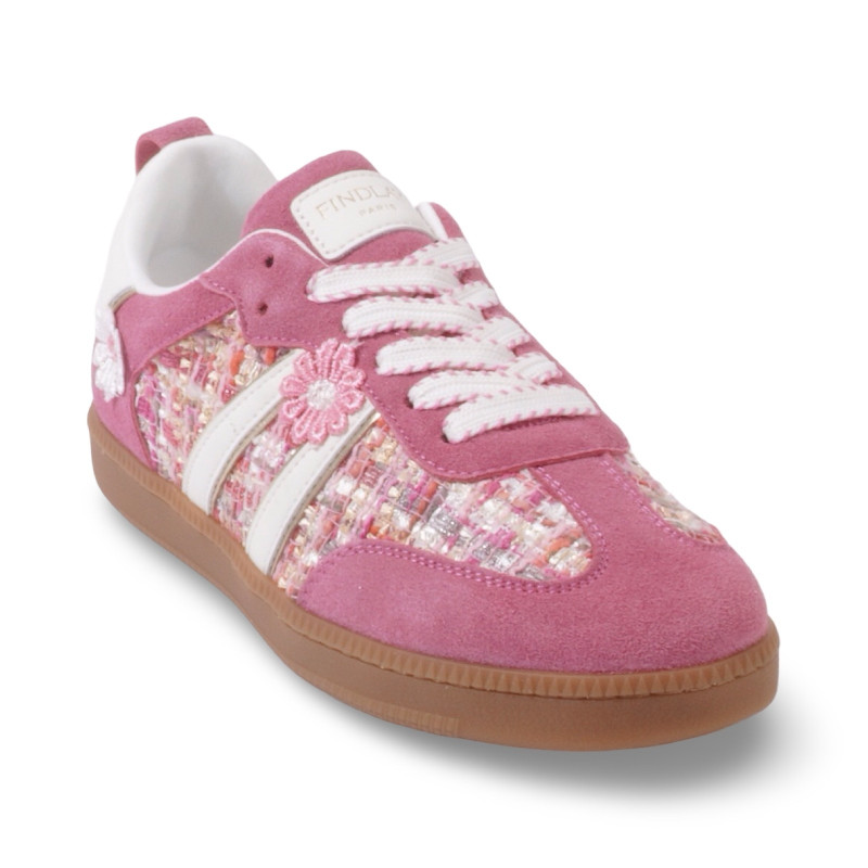Un esprit rétro revisité avec une touche florale pleine de fraîcheur. Les baskets Capucine associent une matière effet daim douce au toucher à des empiècements en tweed délicatement texturés, créant un contraste raffiné et lumineux.