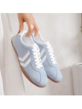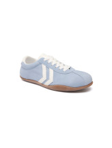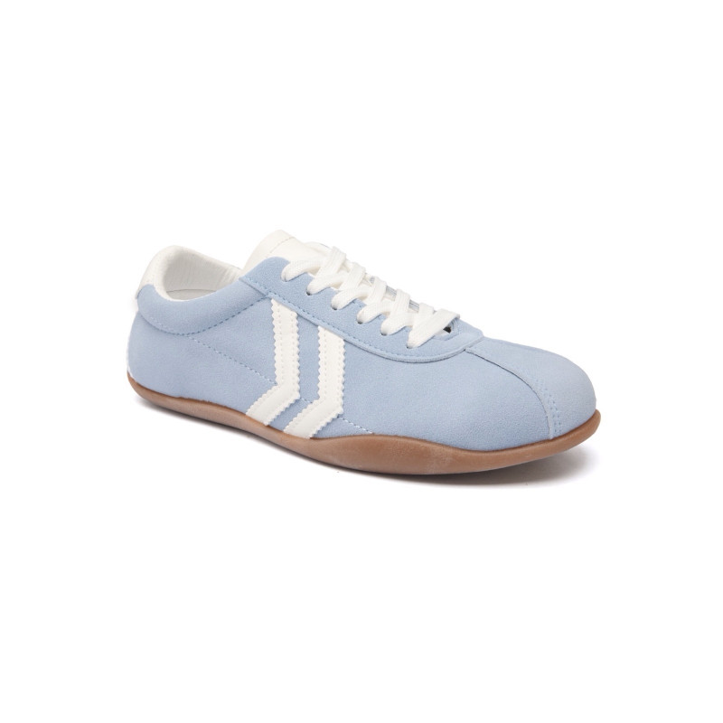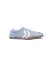 Cette basket basse séduit par son style rétro minimaliste et sa silhouette affinée. Confectionnée dans une matière à finition textile, elle présente une teinte beige ou bleue douce rehaussée de bandes latérales contrastantes qui structurent élégamment le modèle.