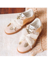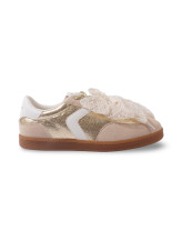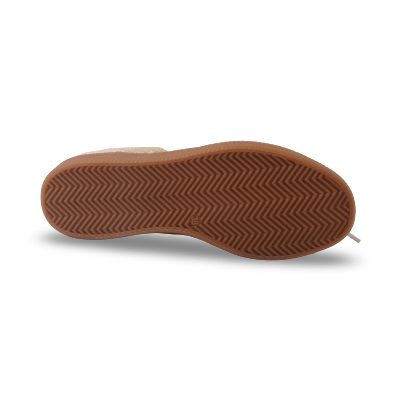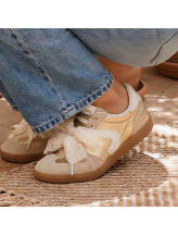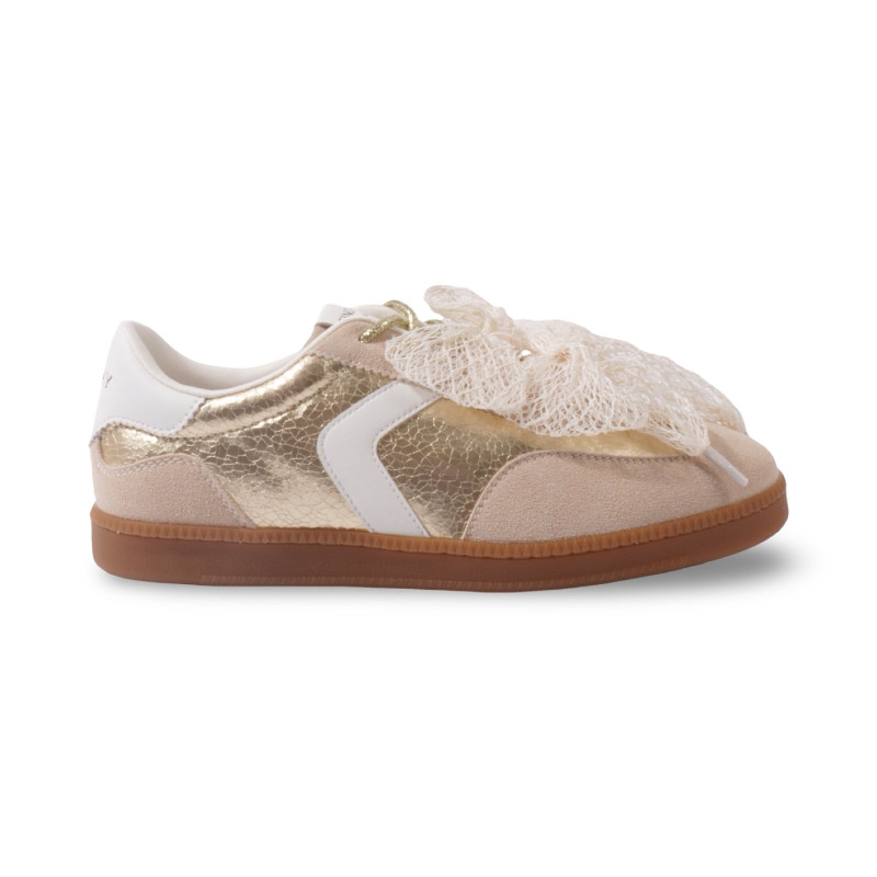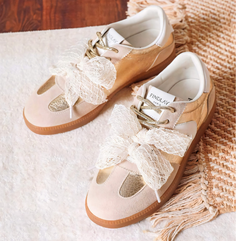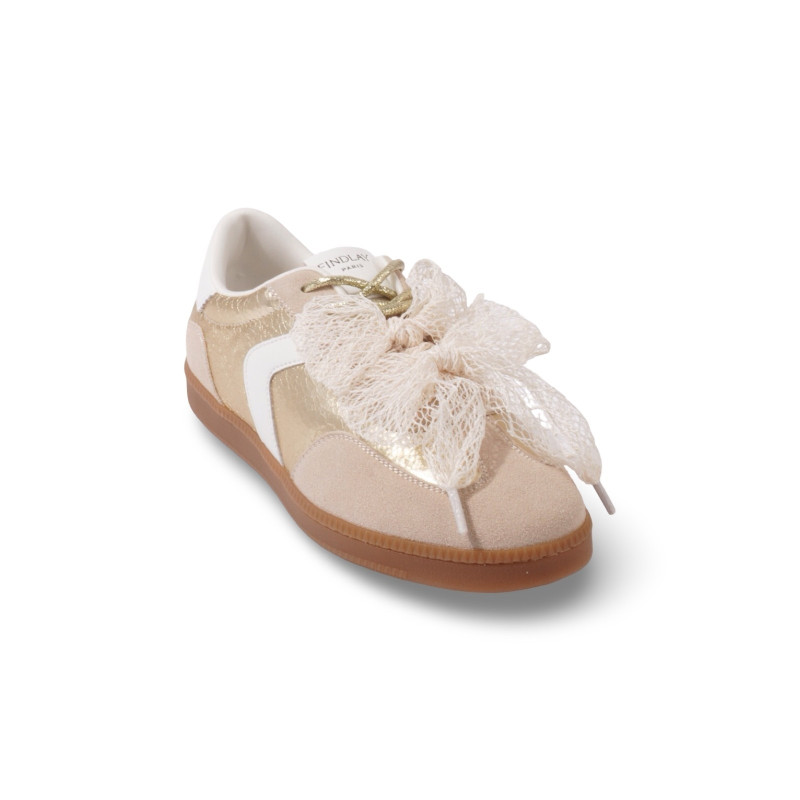 Le détail signature : un large nœud en matière textile effet dentelle qui habille le dessus du pied et attire immédiatement le regard. Les empiècements aux reflets dorés viennent sublimer l’ensemble, tandis que la semelle gomme apporte confort et stabilité au quotidien.