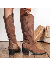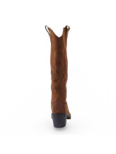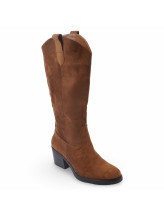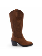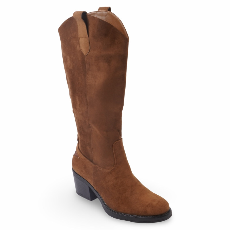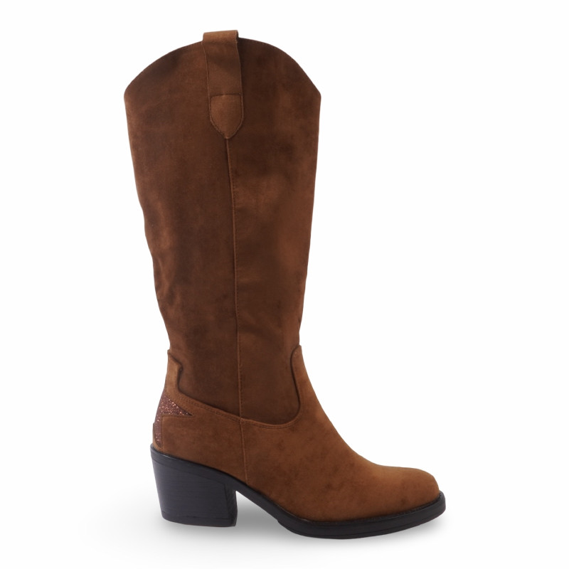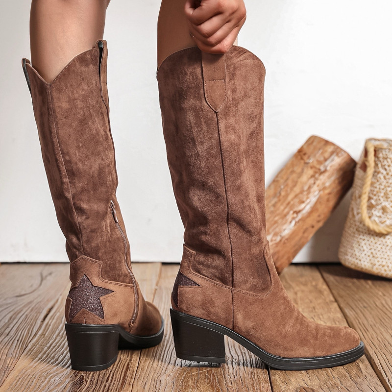 La botte Savana incarne l’esprit western revisité avec une touche féminine et moderne. Réalisée en matière effet suède brun chaud, elle se distingue par sa tige montante au galbe élégant et son étoile scintillante placée subtilement à l’arrière.