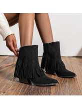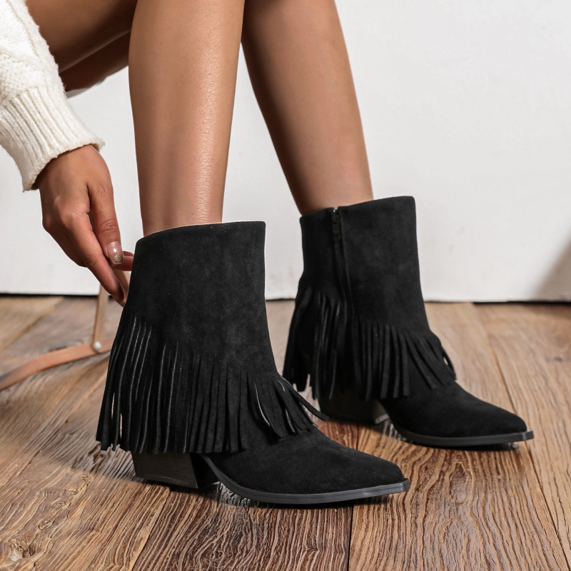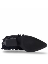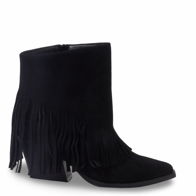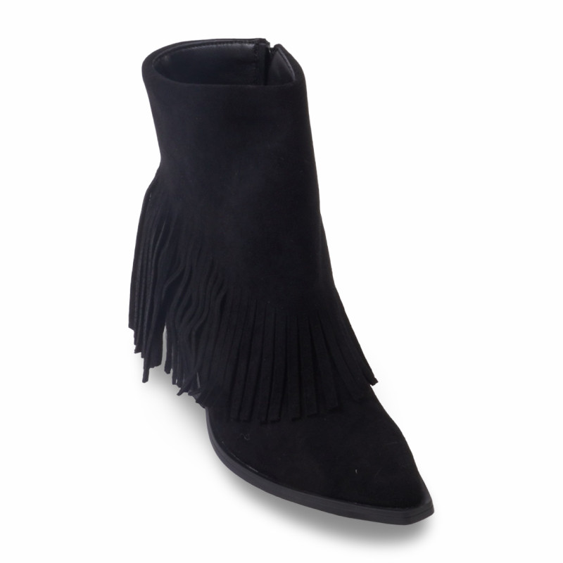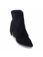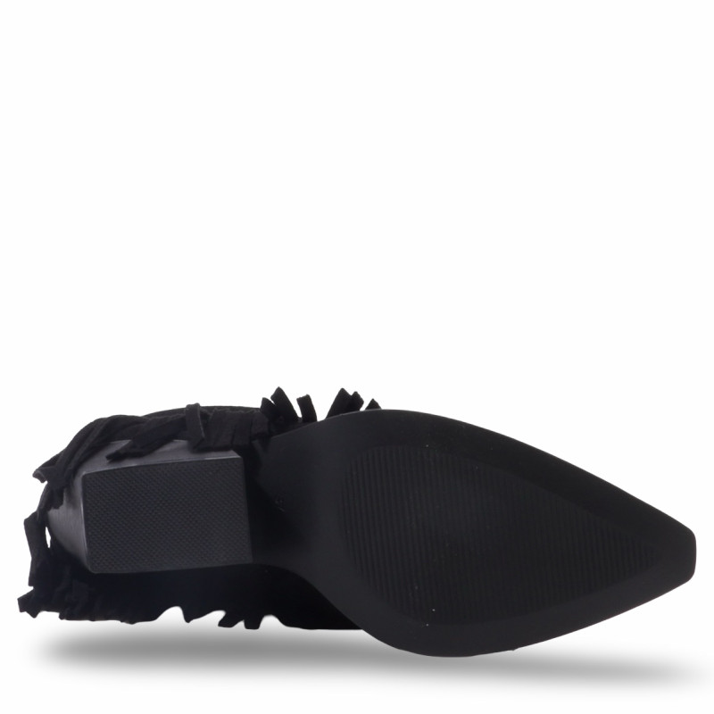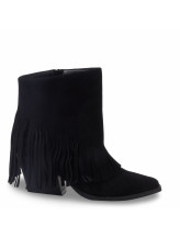 La bottine Althéa s’inspire des tendances western avec un design audacieux et plein de caractère. Confectionnée en matière effet suède noir, elle se distingue par ses longues franges fluides qui accompagnent chaque mouvement avec élégance.
