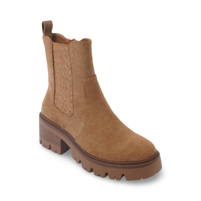 Boots plates esprit chelsea revisitées, déclinées en deux versions : beige clair effet daim avec empiècements latéraux texturés aux reflets dorés, et noir intense effet cuir lisse souligné d’inserts à motif ton sur ton.