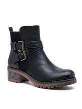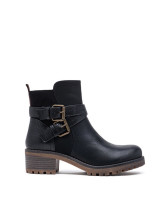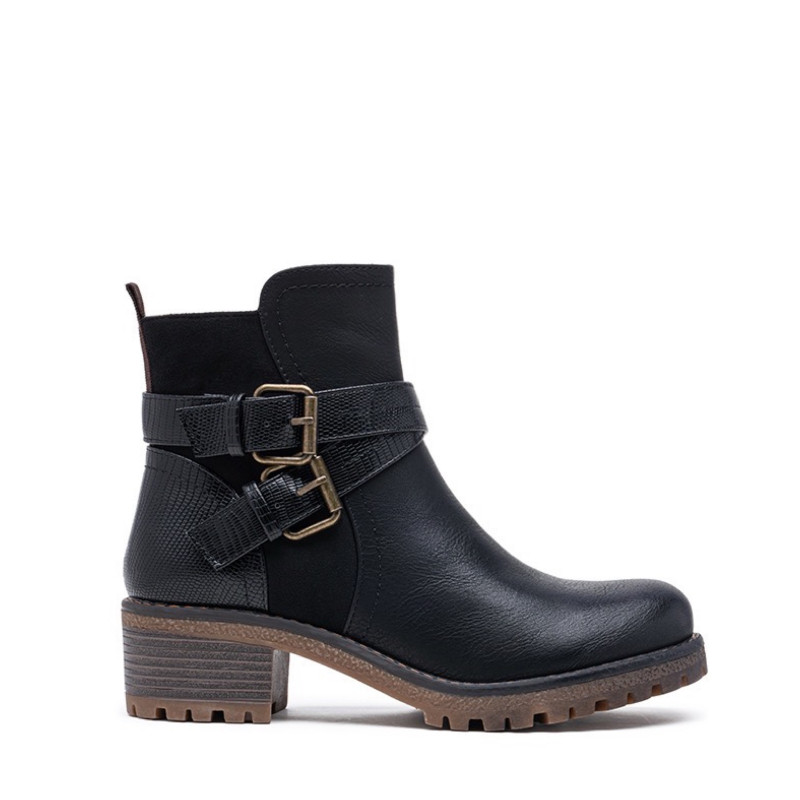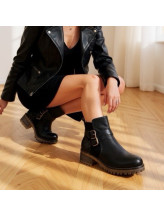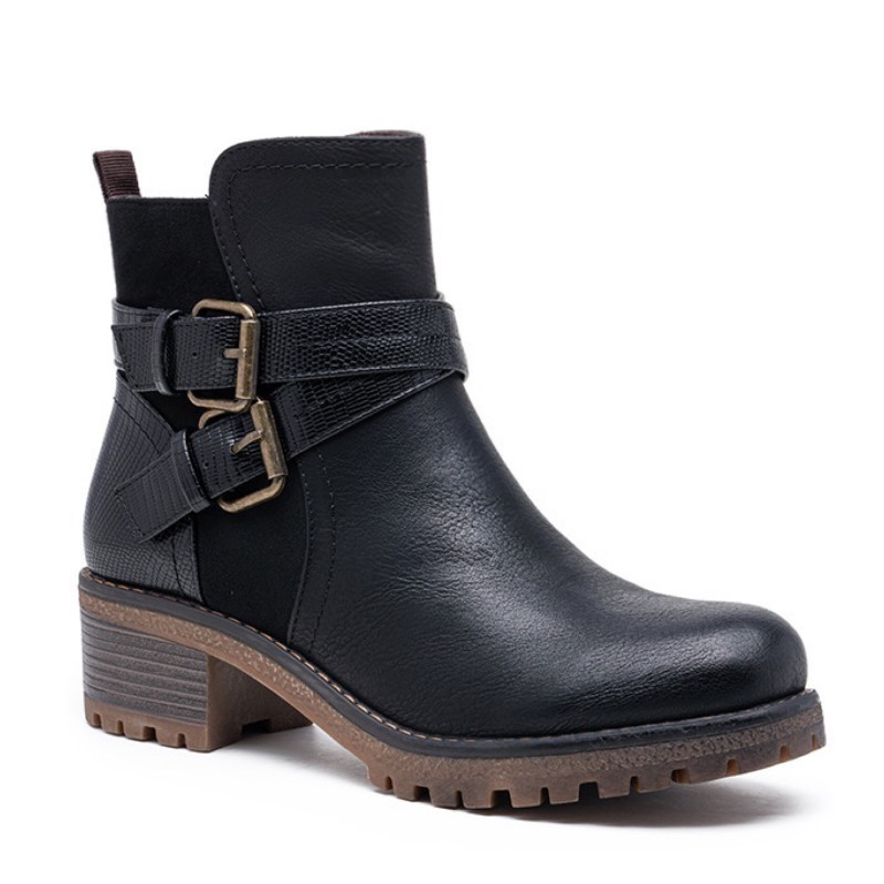 Boots femme Nola à double boucle et semelle crantée. Look biker chic et confort assuré. Disponibles en noir et brun cognac.