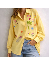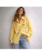 Cette chemise fluide séduit par son esprit lumineux et son univers graphique délicat. Sa finition textile légère met en valeur une série de broderies colorées mêlant palmiers, cœurs, arcs-en-ciel et motifs solaires, créant une allure joyeuse et singulière.