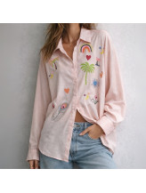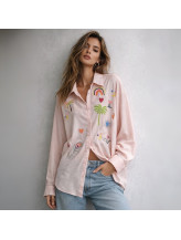 Cette chemise fluide séduit par son esprit lumineux et son univers graphique délicat. Sa finition textile légère met en valeur une série de broderies colorées mêlant palmiers, cœurs, arcs-en-ciel et motifs solaires, créant une allure joyeuse et singulière.