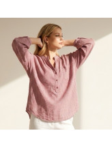 Dotée d’un col tunisien avec patte de boutonnage, elle offre un décolleté subtil et féminin. Ses manches longues légèrement bouffantes, resserrées aux poignets, ajoutent du volume et structurent la silhouette avec douceur.