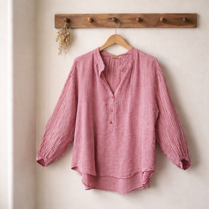 La blouse Camélia séduit par son style à la fois délicat et intemporel. Son motif à fines rayures apporte une touche d’élégance discrète, tandis que sa coupe fluide assure un porté confortable au quotidien.