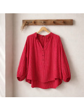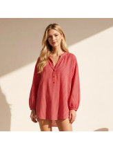 Dotée d’un col tunisien avec patte de boutonnage, elle offre un décolleté subtil et féminin. Ses manches longues légèrement bouffantes, resserrées aux poignets, ajoutent du volume et structurent la silhouette avec douceur.