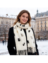 Cette écharpe offre une interprétation moderne du motif félin avec une série de silhouettes de chats stylisées, rehaussées de touches métalliques discrètes. Le tissage doux et enveloppant apporte une sensation de chaleur immédiate, idéale pour la saison froide. Son format généreux permet de la porter aussi bien en écharpe qu’en châle, tout en conservant une allure élégante et structurée.