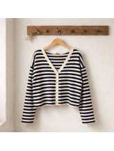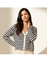 Le gilet Marina revisite l’esprit marin avec une touche moderne et féminine. Son motif à rayures apporte du rythme à la silhouette, tandis que sa coupe légèrement courte structure le look avec élégance.