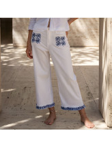 Ce modèle se distingue par ses détails décoratifs délicats : des empiècements brodés sur les poches qui apportent du relief et une finition travaillée au bas des jambes qui ajoute une touche féminine et raffinée.