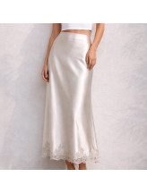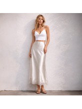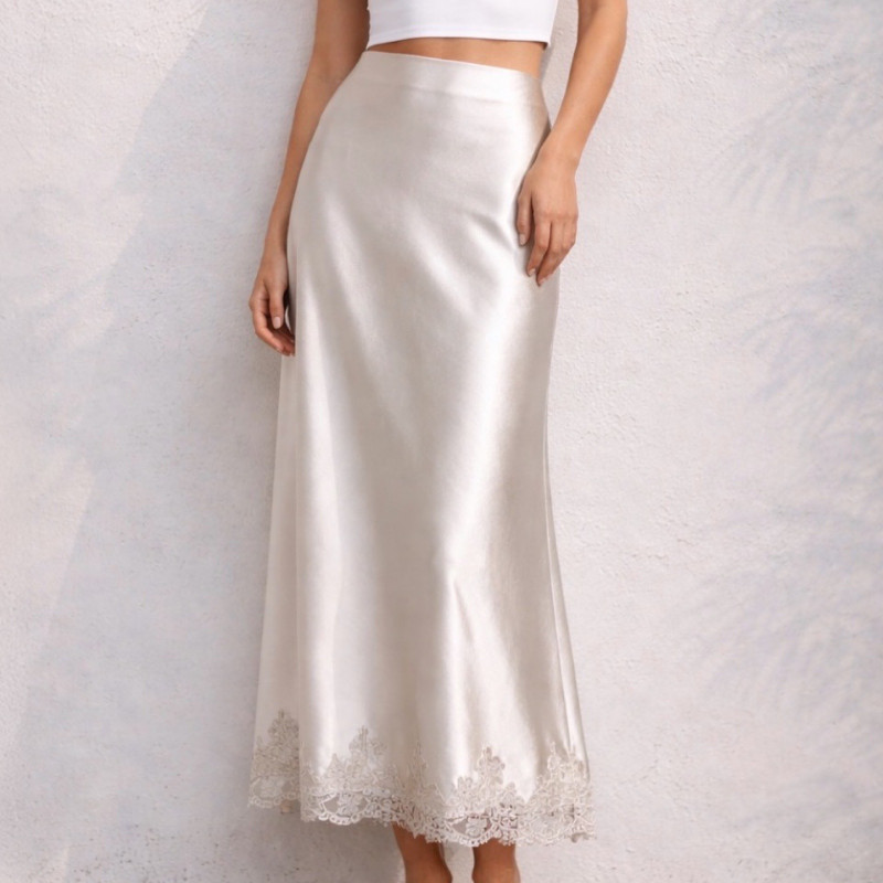 Cette jupe midi séduit par son élégance fluide et son esprit lingerie chic. Sa finition textile satinée capte la lumière avec subtilité, dessinant une silhouette élancée et raffinée.