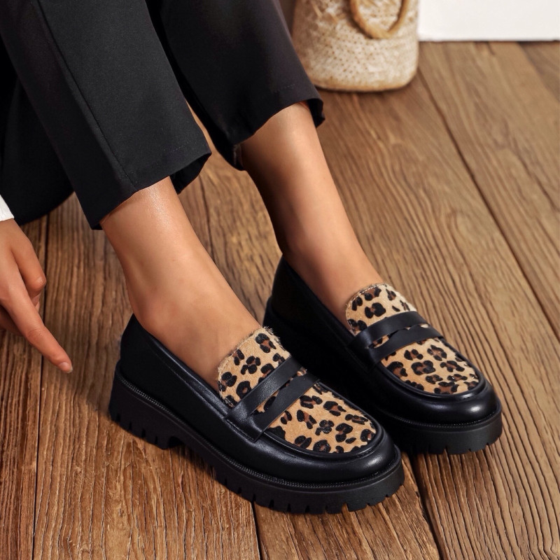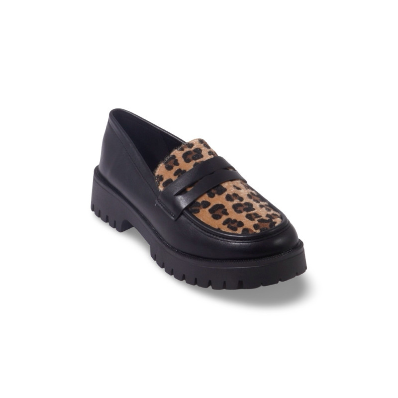 Découvrez notre élégant mocassin noir, parfait pour ajouter une touche de sophistication à votre garde-robe. Avec son imprimé léopard audacieux sur le coup de pied, ce modèle allie confort et style, vous permettant de passer facilement du bureau à une sortie entre amis.