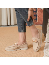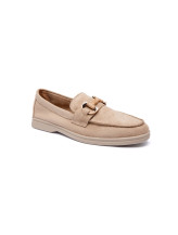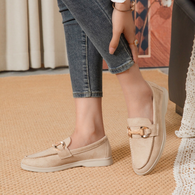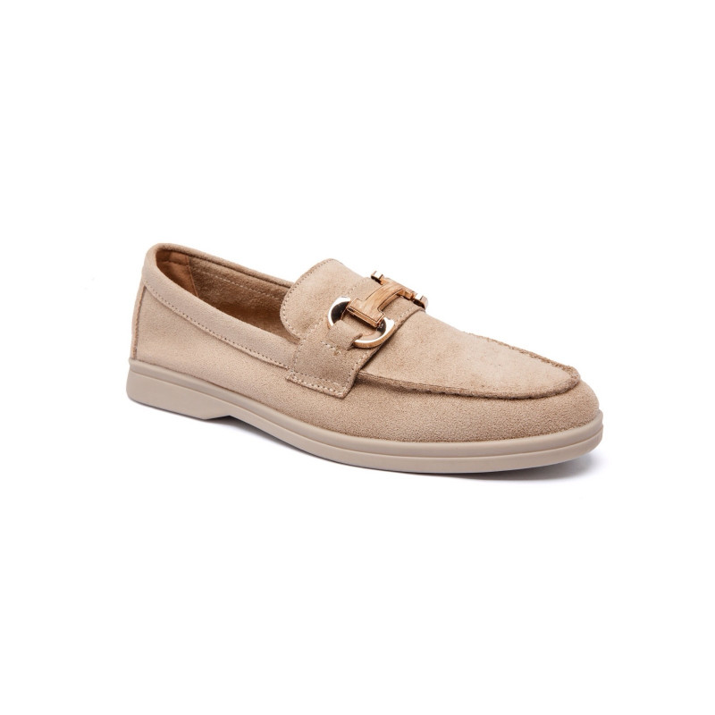 Ce mocassin féminin séduit par son allure chic et intemporelle, soulignée par une matière effet suédé. Son design épuré est rehaussé par un mors décoratif métallique sur le dessus, apportant une touche élégante et structurée à l’ensemble.