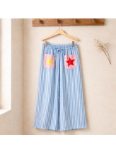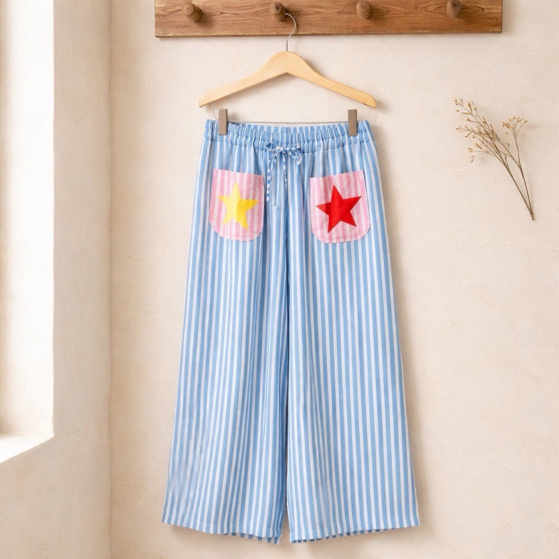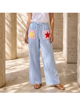 Le pantalon Esmée apporte une touche fraîche et audacieuse au vestiaire estival grâce à son jeu de rayures et ses détails graphiques pleins de caractère. Les poches contrastées ornées d’étoiles donnent immédiatement du style et créent un effet visuel dynamique.