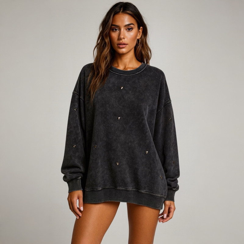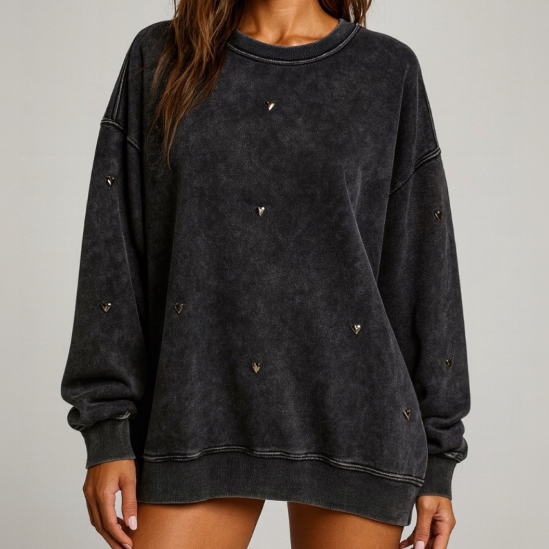 De petits ornements métallisés en forme de cœur sont délicatement répartis sur l’ensemble, apportant une touche féminine subtile à ce basique revisité.
