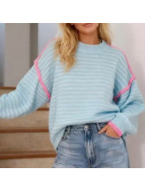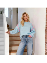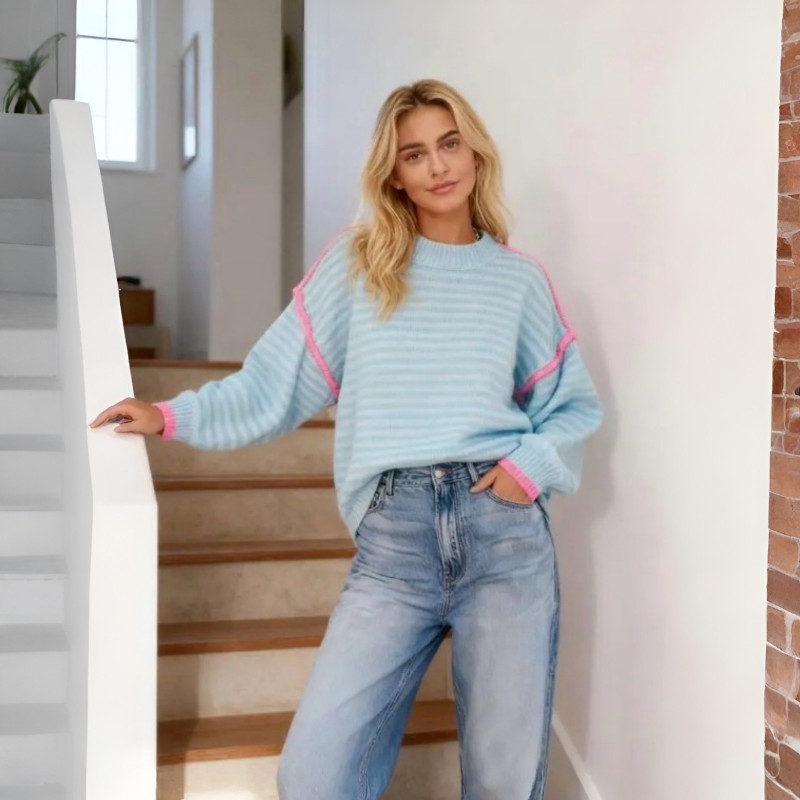 Ce pull joue sur l’équilibre parfait entre douceur et modernité. Sa maille rayée apporte un rythme visuel subtil, tandis que les finitions contrastées le long des épaules et des manches créent une signature graphique élégante.