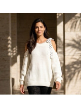 Ce pull revisite la maille cocooning avec une touche résolument féminine. Sa coupe ample enveloppe la silhouette avec douceur, tandis que son épaule subtilement dégagée apporte une note moderne et sensuelle.