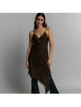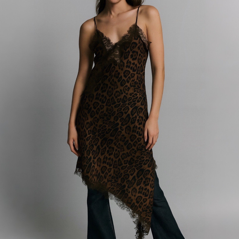 Cette robe à fines bretelles au motif léopard affirme une allure audacieuse et sensuelle. Sa finition textile fluide épouse la silhouette avec légèreté, tandis que le décolleté délicatement bordé de dentelle apporte une touche raffinée.