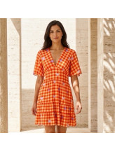 Son décolleté en V souligne élégamment le buste, tandis que les manches courtes apportent un équilibre parfait entre confort et allure. La jupe légèrement évasée avec ses volants crée un mouvement subtil à chaque pas, renforçant son côté naturel et féminin.