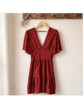 Son décolleté en V souligne élégamment le buste, tandis que les manches courtes apportent un équilibre parfait entre confort et allure. La jupe légèrement évasée avec ses volants crée un mouvement subtil à chaque pas, renforçant son côté naturel et féminin.