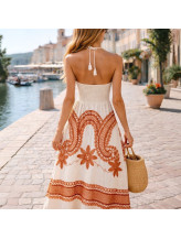 Le bustier met en valeur le haut du corps avec finesse, soutenu par de fines attaches au cou qui dégagent les épaules et accentuent l’allure estivale. La taille smockée au dos assure un maintien confortable et épouse la silhouette avec justesse.