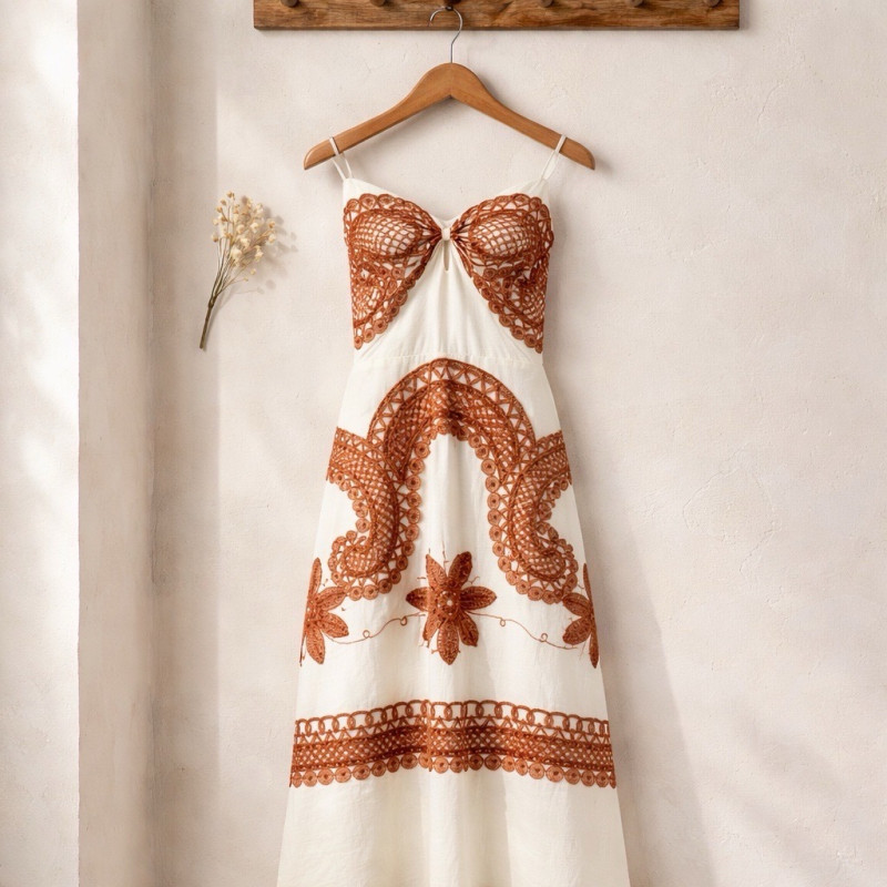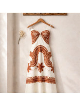 La robe Elvire impose une allure solaire et sophistiquée, pensée pour sublimer chaque silhouette avec naturel. Son jeu de broderies contrastées crée un visuel riche et structuré, apportant du caractère tout en restant parfaitement élégant.