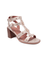 Cette sandale à talon séduit par son allure sophistiquée et sa matière effet suédé lumineux. Son design structuré est composé de brides multiples ornées de clous métalliques dorés, créant un jeu de lignes élégant sur le pied.