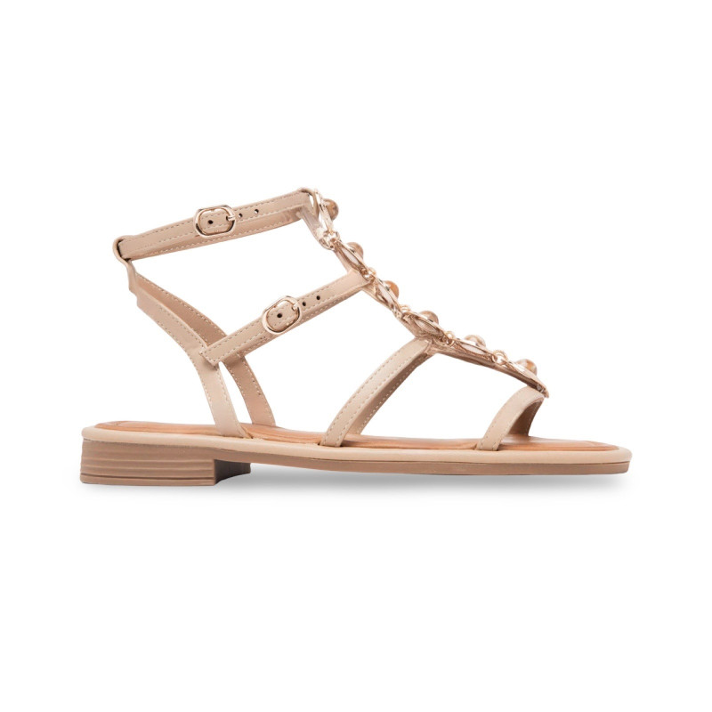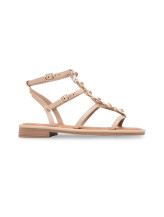 Conçue dans une matière effet cuir, elle présente de fines brides entrecroisées qui épousent élégamment le pied, sublimées par une rangée centrale d’ornements ronds à l’aspect bijou.