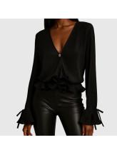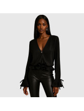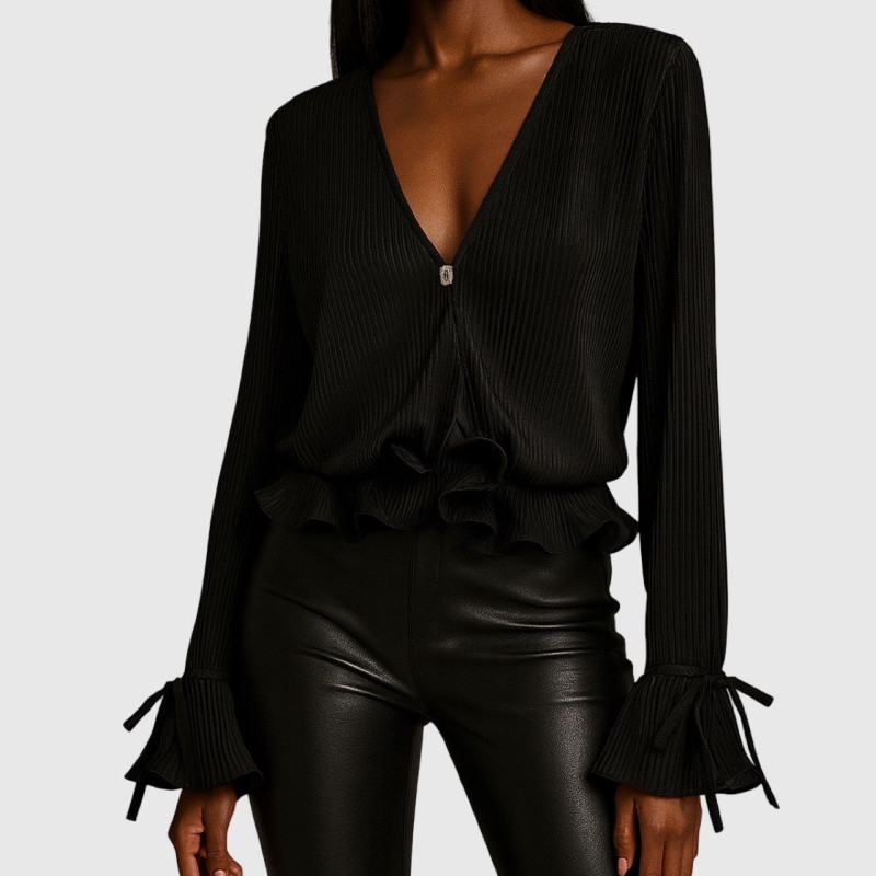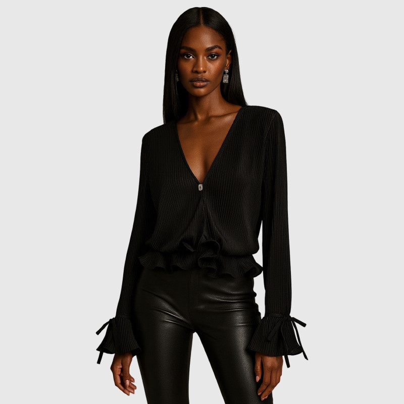 Ce top noir séduit par son allure sensuelle et structurée. Sa finition textile plissée dessine un jeu de relief subtil, tandis que son décolleté profond en V apporte une élégance affirmée.