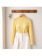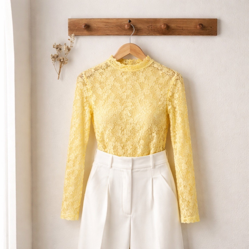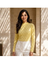 Son col montant délicat structure le haut avec élégance, tandis que la matière texturée crée un effet visuel subtil et sophistiqué. Les manches longues équilibrent parfaitement la silhouette et renforcent son allure chic et moderne.