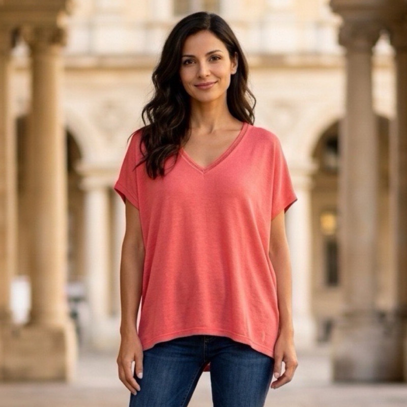 Son col en V délicatement dessiné met en valeur le port de tête et apporte une touche féminine subtile. Les finitions au niveau du col ajoutent du relief et une dimension élégante à cette pièce essentielle du vestiaire.