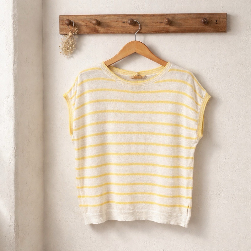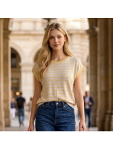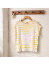 Sa coupe légèrement ample et ses manches courtes offrent un tombé naturel et confortable, idéal pour la mi-saison ou les journées estivales. Le jeu de rayures horizontales, décliné en plusieurs coloris, permet de varier les styles tout en conservant une base élégante et facile à porter.