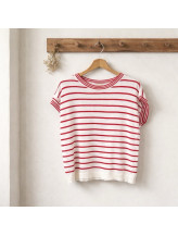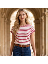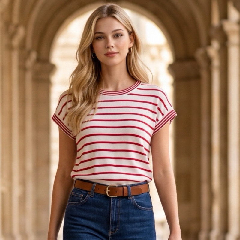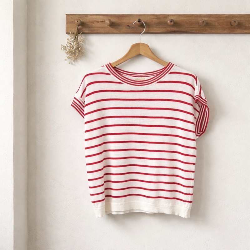 Sa coupe légèrement ample et ses manches courtes offrent un tombé naturel et confortable, idéal pour la mi-saison ou les journées estivales. Le jeu de rayures horizontales, décliné en plusieurs coloris, permet de varier les styles tout en conservant une base élégante et facile à porter.