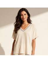 Le top Louna séduit par sa coupe fluide et son style épuré, idéal pour un look à la fois confortable et féminin. Son col V délicat met en valeur le décolleté tandis que sa forme ample assure une grande liberté de mouvement.
