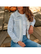 La veste Capucine revisite la veste en denim avec une approche délicate et féminine. Son tissu à fines rayures bleu clair apporte une fraîcheur immédiate à la silhouette et s’inscrit parfaitement dans un esprit estival élégant.