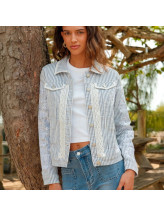 Les empiècements de dentelle subtilement intégrés sur le devant et les manches donnent du relief au modèle et créent un contraste raffiné avec les rayures. Ce travail de matière apporte une touche romantique tout en conservant la structure d’une veste courte facile à porter.