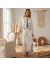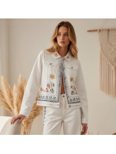 La veste Célestine séduit par son esprit bohème chic et ses détails délicatement travaillés. Sa teinte écrue lumineuse apporte douceur et élégance tandis que les broderies florales colorées viennent animer la pièce avec finesse.